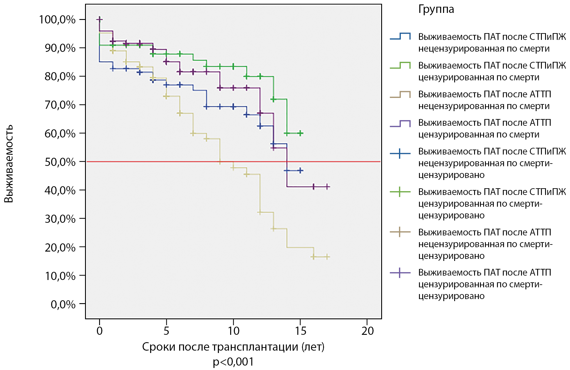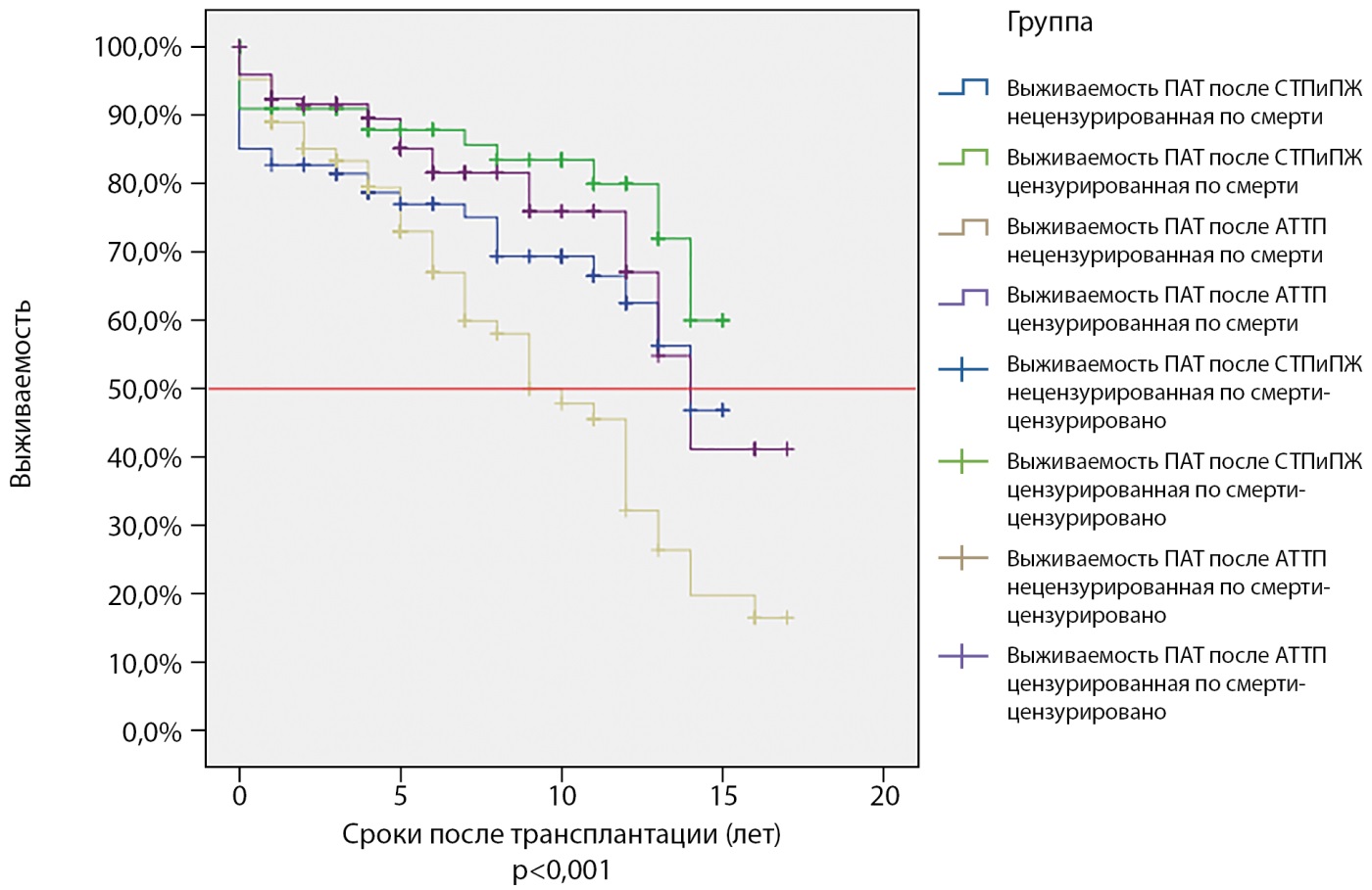 1-летняя не цензурированная по смерти выживаемость ПАТ составила 84,5%, ТПЖ — 82,3%, реципиентов — 88,1%.
