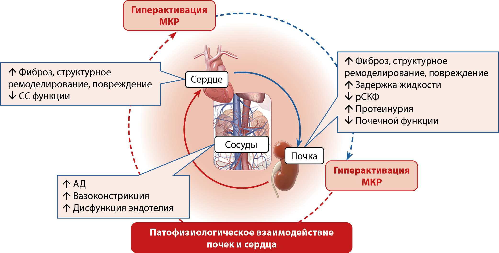 Рисунок 1. Патофизиологическое взаимодействие заболеваний почек и сердца.