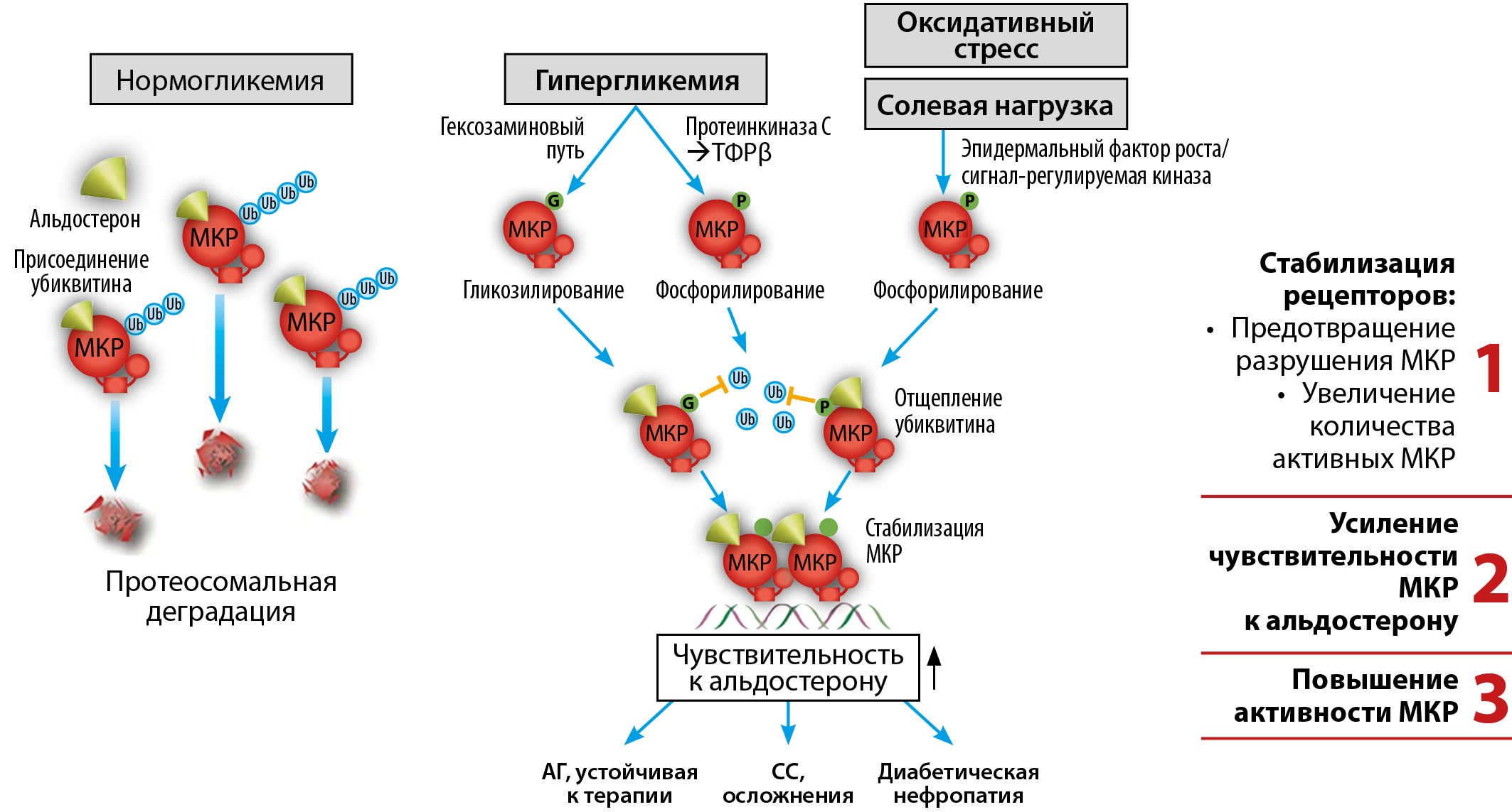 Метаболические нарушения, происходящие у пациентов с СД2, напрямую способствуют гиперактивациии МКР посредством O-GlcNAc-гликозилирования рецепторов. Это особый вид модификации МКР, который делает их более устойчивыми к разрушению и активными в отношении запуска воспалительных и фиброзных процессов в органах-мишенях. Вначале происходит гликозилирование и стабилизация рецепторов: в условиях высокого уровня глюкозы молекула глюкозы присоединяется к МКР, предотвращая их разрушение. Это увеличивает количество активных МКР в клетках, особенно в тканях почек и сердечно-сосудистой (СС) системы. Далее у гликозилированных МКР повышается чувствительность к альдостерону, что в итоге приводит к тому, что рецепторы дольше остаются в активном состоянии и выполняют функцию «переключателя» для включения определенных генов, отвечающих за выработку медиаторов воспаления и фиброза (рис. 2) [27].