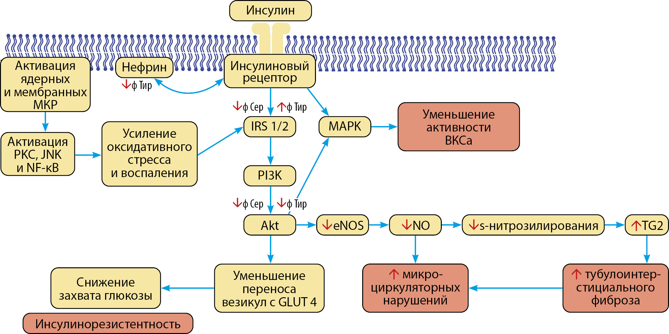 Примечание. Akt — протеинкиназа В; ВКСа — порообразующие субъединицы Са-активируемых К-каналов; eNOS — эндотелиальная NO-синтаза; GLUT 4 — глюкозный транспортер тип 4; IRS-1/2 — субстрат инсулинового рецептора 1/2; JNK — N-концевые киназы c-Jun; NF-kB — ядерный фактор κB; NO — оксид азота; PI3K — фосфоинозитид-3-киназа; PKC — протеинкиназа С; TG2 — трансглутаминаза 2; ф Сер — фосфорилирование серина; ф Тир — фосфорилирование тирозина.