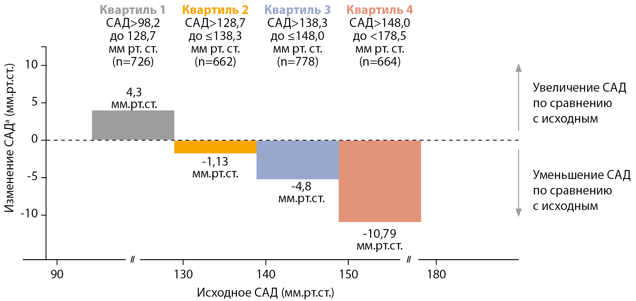 Примечание. а — скорректированное среднее изменение САД по сравнению с исходным значением, рассчитанное методом наименьших квадратов (результаты группы плацебо не включены в анализ); САД — систолическое артериальное давление.