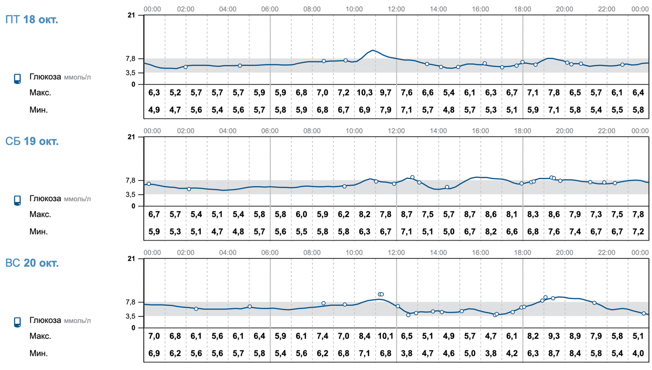 На момент октября 2024 г.: беременность 25–26 неделя (рис. 2), пациентка соблюдает все предписанные рекомендации врачей. Зафиксирована положительная тенденция в достижении целевых показателей углеводного обмена (рис. 3), однако у пациентки отмечено ухудшение показателей липидного обмена (триглицериды 10–16,0 ммоль/л), в виду чего 10.10.2024 г. в Национальном медицинском исследовательском центре акушерства, гинекологии и перинатологии им. академика В.И. Кулакова выполнен сеанс липопротеинового плазмафереза.