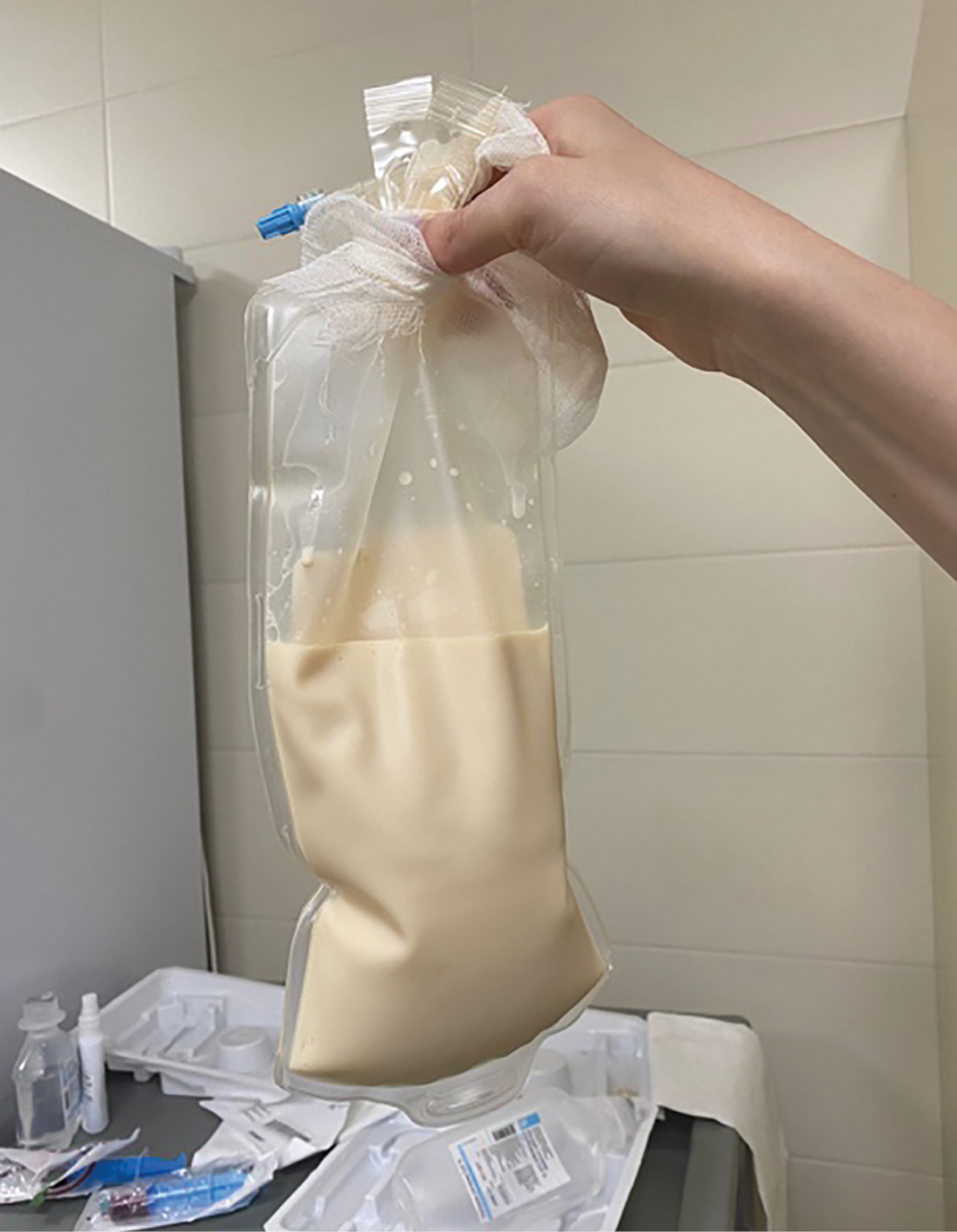 Однако, несмотря на многокомпонентную лекарственную терапию, по результатам биохимического анализа крови выявлен хилез, что не позволило оценить другие показатели анализов крови. В связи с высоким риском развития острого панкреатита (жалобы на момент госпитализации на боли в животе, тошноту, анамнестические данные о многократных обострениях панкреатита, текущий хилез), проведен 1 сеанс плазмафереза, внешний вид плазмы крови по окончании процедуры приведен на рисунке 1.