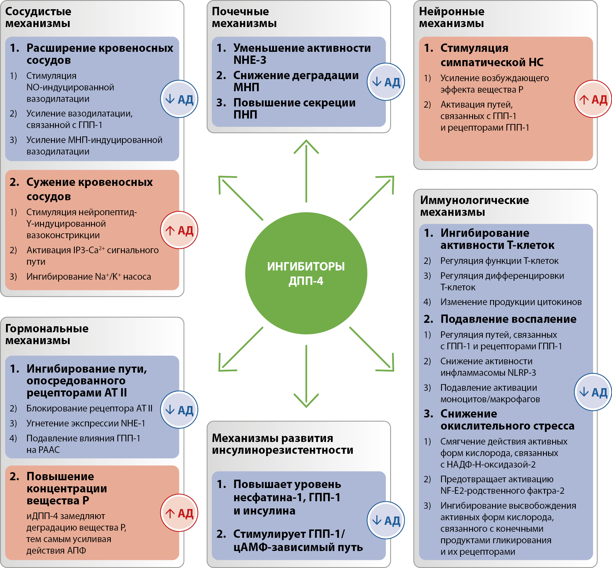 Рисунок 1. Потенциальные механизмы ингибиторов дипептидилпептидазы-4 в регуляции артериального давления. Адаптировано по Zhang J. с соавт. [51].