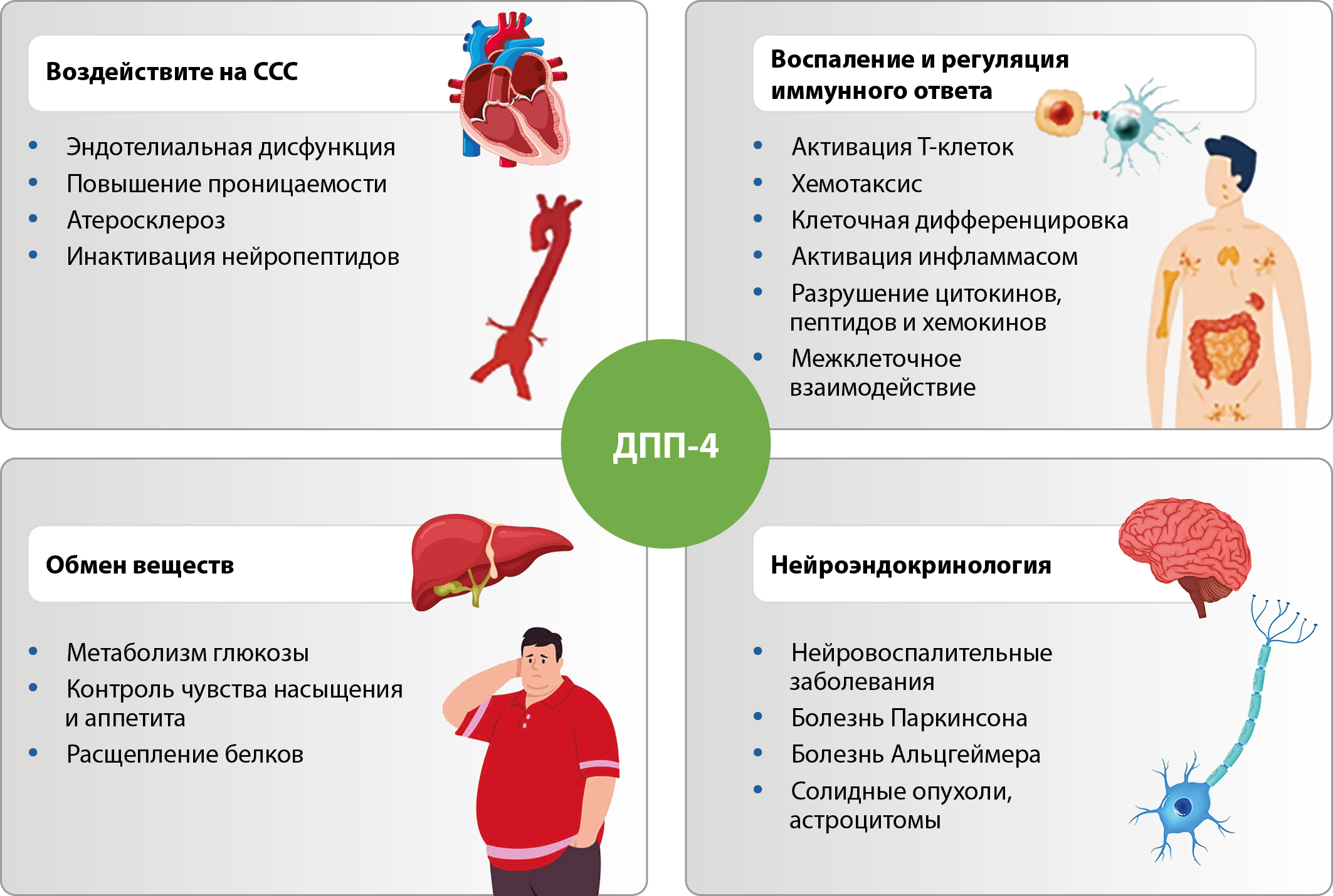 ДПП-4, фермент сериновой протеазы и адипокин CD36, участвует в многочисленных физиологических и патологических процессах (рис. 2): регулирует воспалительные и иммунные реакции, контролирует метаболизм глюкозы посредством своего протеолитического воздействия на инкретины, оказывает многоплановое воздействие на сердечно-сосудистую систему, включая эндотелиальную дисфункцию и повышенную проницаемость сосудов [93]. Согласно спектру выявленных эффектов, уточняется место иДПП-4 в клинической практике: от безопасности в отношении риска панкреатита или рака pancreas до возможного использования противовоспалительного потенциала в повышении эффективности традиционных методов лечения рака и функции иммунной регуляции при аутоиммунных и воспалительных заболеваниях.