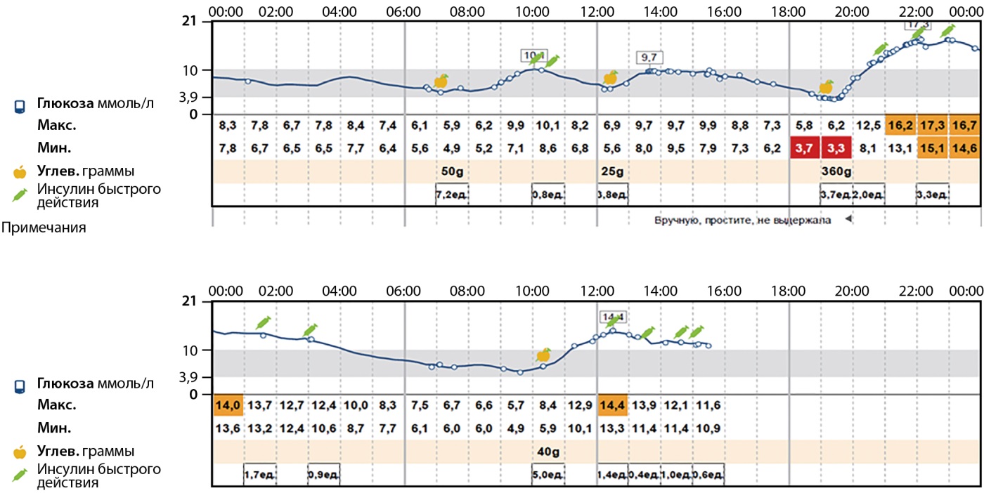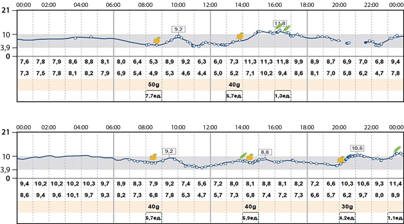 В результате неоднократного индивидуального обучения основам инсулинотерапии при СД1, использованию инсулиновой помпы, применению современных инсулинов и регулярного контроля гликемии, как при помощи глюкометра, так и непрерывного мониторирования глюкозы, показатели гликемии приблизились к целевым значениям (рис. 2).