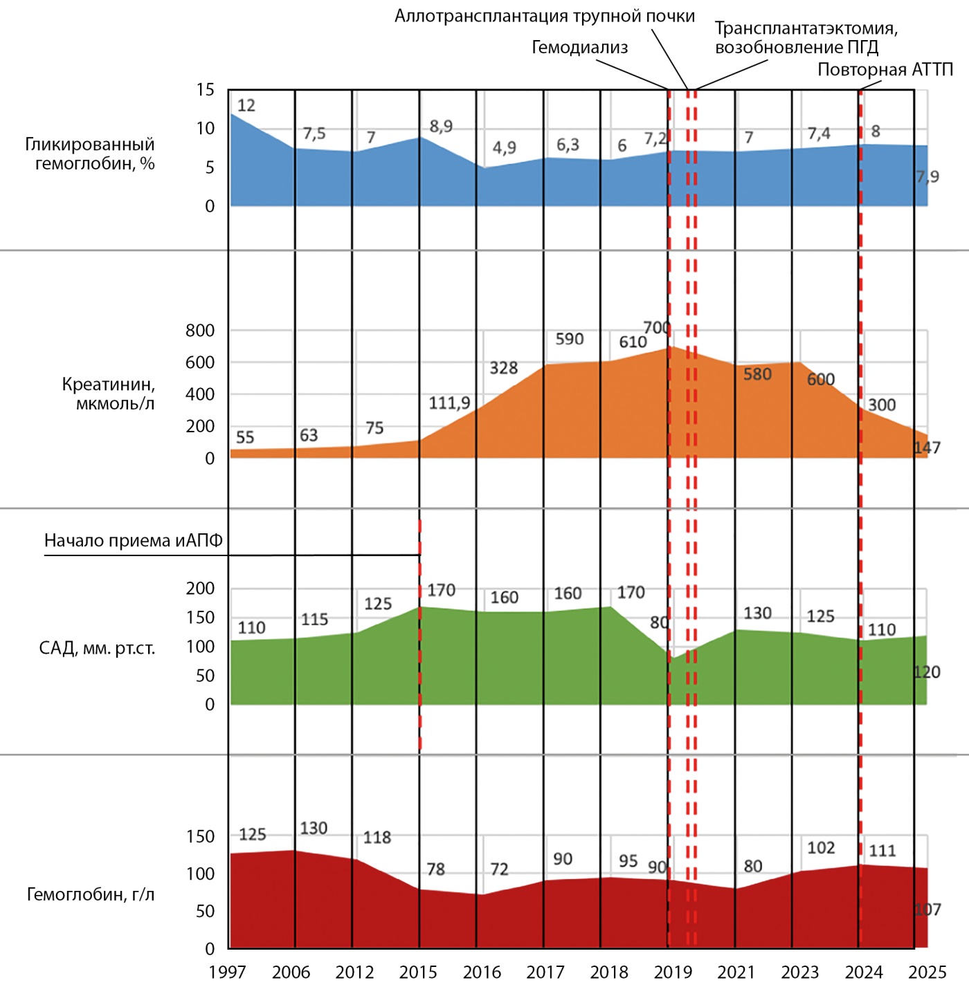 08.06.2019 г. в связи с жалобами на повышение температуры, резкое снижение диуреза при дообследовании выявлен острый пиелонефрит трансплантата, проведен бактериальный посев мочи с оценкой чувствительности к антибиотикам, получен рост: Klebsiela Pneumoniae, резистентной к антибактериальной (АБ) терапии, в диагностически значимом титре. В связи с неэффективностью консервативной терапии, по жизненным показаниям 23.07.2019 г. выполнена трансплантатэктомия. Сохранялись признаки синдрома системной воспалительной реакции, назначена массивная АБ терапия (в том числе амикацином — с дальнейшей потерей слуха, пользуется слуховым аппаратом). Возобновлен ПГД, который получала на протяжении 5 лет, с удовлетворительной переносимостью. Во время проведения ЗПТ ПГД отмечалась нормотония, без приема антигипертензивной терапии. С января 2023 г. включена в лист ожидания траснплантации почки, в феврале 2024 г. выполнена повторная АТТП в Московском многопрофильном научно-клиническом центре им. С.П. Боткина, функция трансплантата немедленная, креатинин после операции — 140–190 мкмоль/л, возобновлена трехкомпонентная иммуносупрессивная терапия, которую получает по настоящее время. В октябре 2024 г. СКФ по пробе Реберга-Тареева — 21,4 мл/мин, соотношение альбумин/креатинин в разовой порции утренней мочи — 4,1 мг/ммоль, что соответствует ХБПС4А2. При УЗИ трансплантата и УЗДС его сосудов патологии не выявлено. После повторной АТТП от 2024 г. АД — в пределах нормы без антигипертензивной терапии.