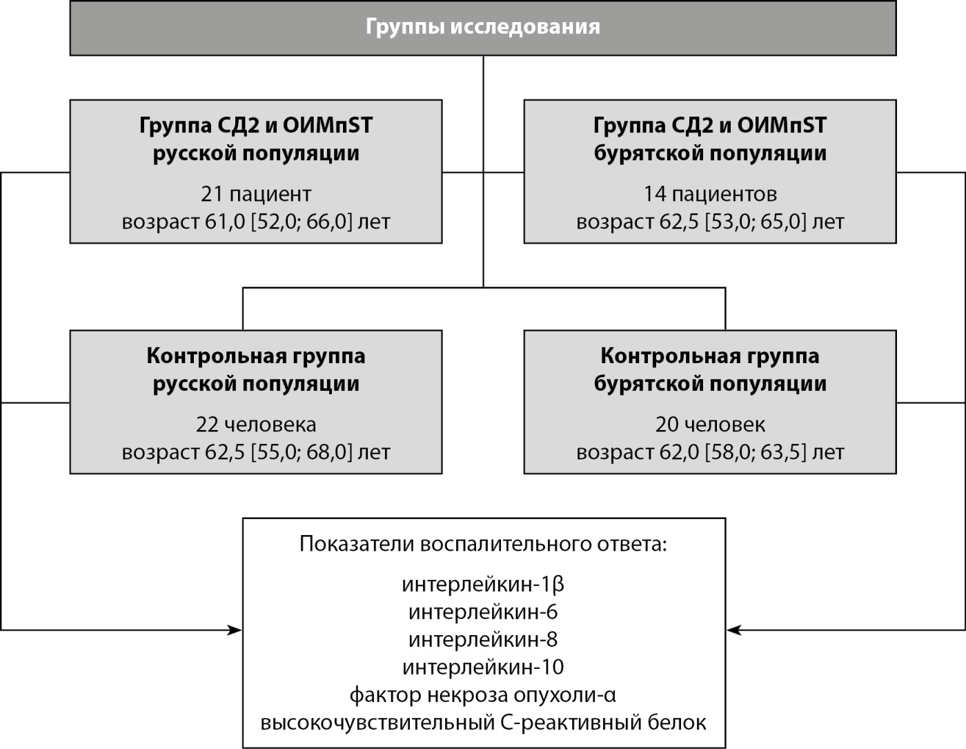 МАТЕРИАЛЫ И МЕТОДЫ. Проведено обсервационное одноцентровое одномоментное сравнительное исследование на базе кафедры эндокринологии ИГМАПО-филиала ФГБОУ ДПО РМАНПО Минздрава России и Республиканской клинической больницы имени Н.А. Семашко г. Улан-Удэ Минздрава Республики Бурятия. В исследование включены больные СД2 и ОИМпST с участием контрольной группы. У всех участников исследования был собран анамнез, проведено клинико-функциональное обследование. Все участники подписали информированное согласие на участие в исследовании. Методом твердофазного иммуноферментного анализа в сыворотке крови определяли показатели интерлейкина-1β (ИЛ-1β), интерлейкина-6 (ИЛ-6), интерлейкина-8 (ИЛ-8), интерлейкина-10 (ИЛ-10), фактора некроза опухоли-α (ФНО-α) и уровень высокочувствительного С-реактивного белка (вч-CРБ) иммунотурбидиметрическим методом. У больных СД2 и ОИМпST забор венозной крови проводили натощак в первые сутки от момента развития ангинозного приступа.