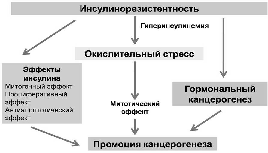 Frasca F. и соавт. (2007) утверждают, что рецепторы АМФ-тирозинкиназы играют ключевую роль в развитии и прогрессировании рака человека, так как наличие рецепторов к инсулину и тирозинкиназовых рецепторов к ИФР-1 и ИФР-2 в опухолевой клетке четко документировано [88]. По их мнению, гиперинсулинемия и нарушения функции тирозинкиназового рецептора, обуславливающие развитие ИР, играют важнейшую роль в биологии рака человека [88].