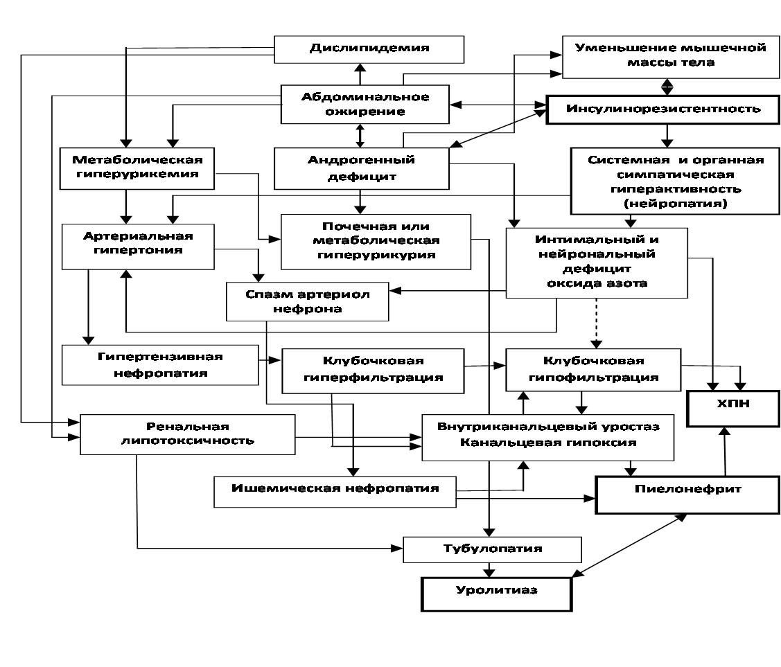 Основная физиологическая функция инсулина сводится к поддержанию важной гомеостатической константы метаболизма человека – обеспечению нормального уровня глюкозы в крови и поддержанию адекватного обмена глюкозы как основного источника энергии внутри клетки [6, 17, 18]. ИР/гиперинсулинемия, являясь ключевым патогенетическим фактором МС, есть комплекс компенсаторно-приспособительных реакций, развивающихся на фоне ожирения, часто ассоциированного с андрогенным дефицитом у мужчин [19, 20–24]. При развитии и прогрессировании ожирения резко снижается экспрессия гена рецептора инсулина, что ведет к уменьшению плотности рецепторов на поверхности клеток и возникновению резистентности к инсулину, а одновременное повышение уровня основного гормона жировой ткани – лептина – разрушает функциональную связь между гипофизом и гонадами, что является патогенетической основой формирования и прогрессирования андрогенного дефицита у мужчин одновременно с прогрессированием ожирения и ИР [20–24]. Развивающаяся ИР сопровождается гиперинсулинемией, которая в данном случае обеспечивает поддержание эффективности углеводного обмена и обеспечение адекватной митогенной активности жизнеспособности и деления клеток [20, 21]. Однако ИР имеет не только эндокринологический аспект как ранняя обратимая стадия СД2. Развитие ИР приводит к целому ряду негативных патофизиологических системных реакций, которые способны инициировать механизмы дестабилизации клеток и тканей внутренних органов, включая почки, вызывая в них анатомо-функциональные нарушения.