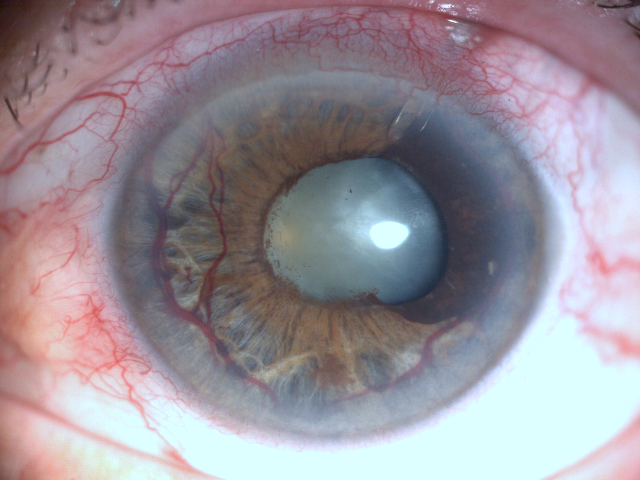 В 100% (28/28) случаев отмечена неоваскуляризация радужки и угла передней камеры (рис. 2). Интраоперационная геморрагия из новообразованных сосудов угла передней камеры и радужки в основном возникала на этапе пункции в зоне планируемой имплантации трубочки или при синустрабекулэктомии, а также за счет быстрого опорожнения передней камеры. Гифема в раннем послеоперационном периоде отмечена в I группе в 30,7% (4/13) случаев, во II группе – в 26,6% (4/15) случаев. Промывание передней камеры и тампонада новообразованных сосудов введением вискоэластика выполнены у всех пациентов I и II группы. Применение высокомолекулярного вискоэластика на этапе пункции передней камеры глаза позволило избежать геморрагических осложнений в оставшихся случаях.