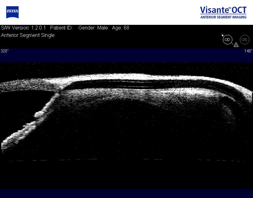 Оптическая когерентная томография переднего отрезка глаза вносит большой вклад в изучение причин гипертензии, визуализации путей оттока внутриглазной жидкости и оценки местоположения дренажей и дренажных устройств. Нами у пациента после имплантации клапана Ahmed установлена миграция трубки в слои склеры, что в последующем привело к повышению ВГД (рис. 3). В литературных источниках встречается описание миграции трубки клапана Ahmed, которая развивается в долговременной перспективе и является редким осложнением. По данным F. Topouzis и соавт., встречаемость данного осложнения составляет 1/31 [19], тогда как D. Budenz и соавт. сообщили о частоте 1/413 пациентов [20].