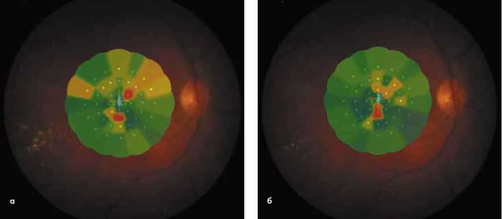 3. Рис. 3. Компьютерная микропериметрия до лечения (а) и через 12 месяцев после комбинированного лазерного воздействия (б). Образования абсолютных скотом в центральном поле зрения не выявлено.