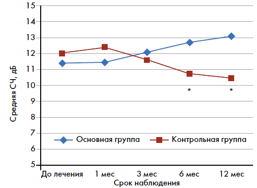 5. Рис. 5. Сравнительная динамика средней СЧ среди пациентов исследуемых групп. *p <0,05. СЧ – центральная светочувствительность сетчатки.