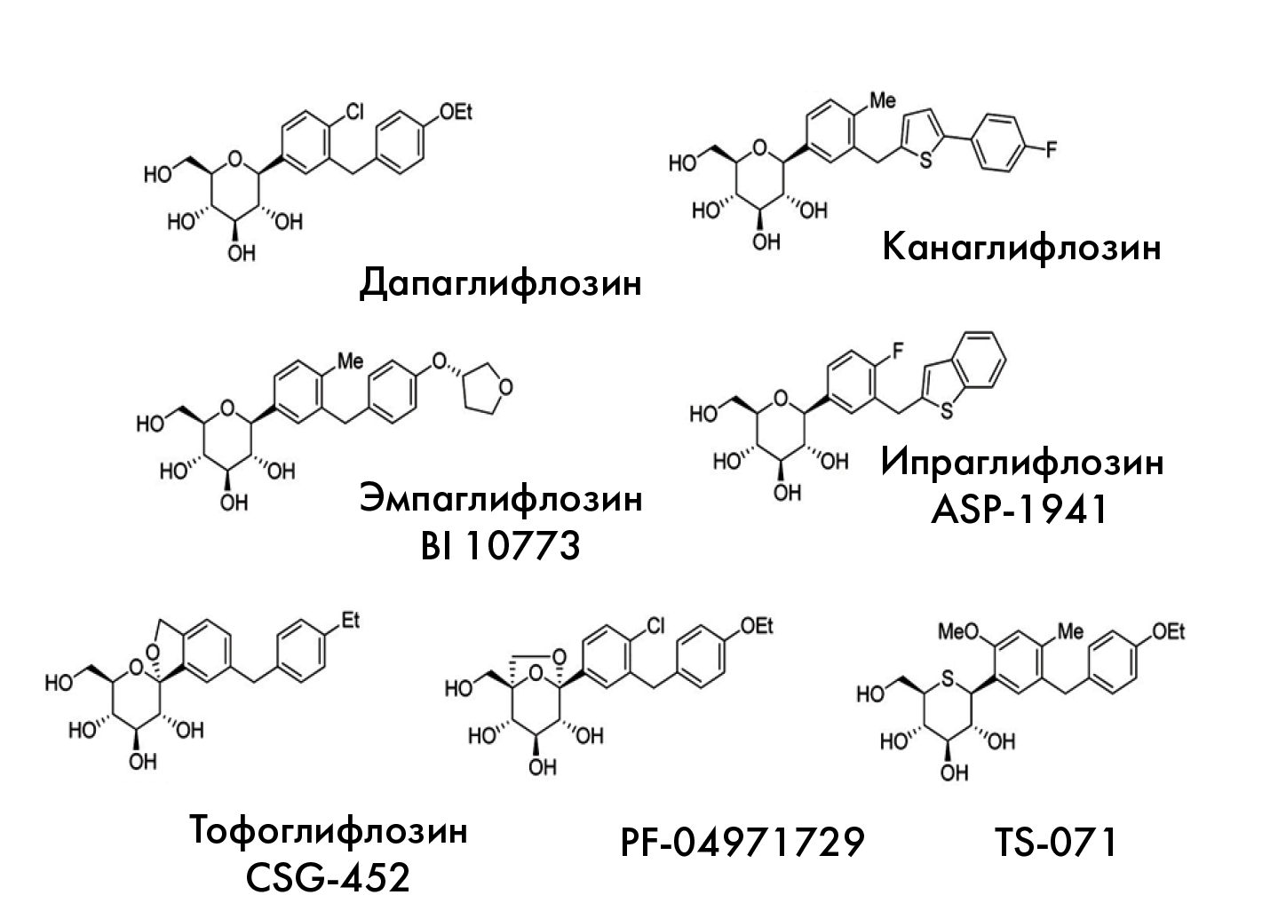 Рис. 1. Структурные формулы ингибиторов SGLT2. Адаптировано из [23].