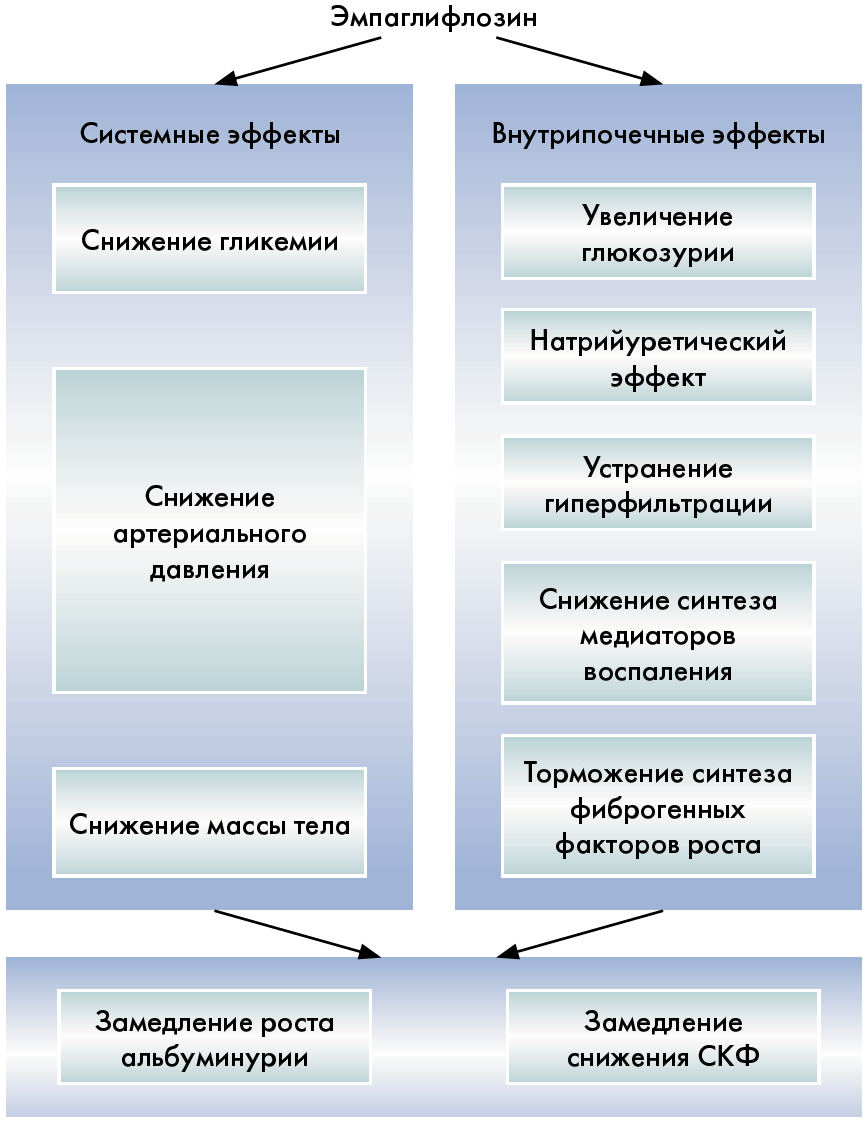 Увеличение реабсорбции глюкозы почкой – одно из важных звеньев патогенеза СД. Основным фактором реабсорбции глюкозы в почечных канальцах является SGLT2, наиболее селективным ингибитором которого является эмпаглифлозин. Применение эмпаглифлозина у больных СД2 позволяет не только улучшить контроль гликемии и снизить частоту сердечно-сосудистых осложнений, но и замедлить темпы развития диабетического поражения почек (снизить скорость нарастания альбуминурии и падения СКФ, уменьшить вероятность развития терминальной почечной недостаточности и смерти от поражения почек). Механизм нефропротективного действия эмпаглифлозина, по-видимому, обусловлен не только снижением гликемии, но и негликемическими эффектами в виде снижения массы тела и АД, коррекции внутрипочечной гемодинамики, увеличения натрийуреза, ингибирования синтеза воспалительных медиаторов и фиброгенных факторов в почках.
