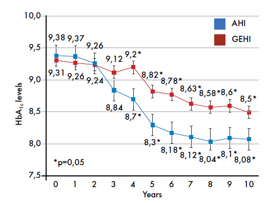 Через 10 лет в обеих группах пациентов не удалось достичь целевых значений гликемии (HbA1с<7%), однако показатель HbA1с у пациентов на АИЧ был достоверно ниже (p<0,05), чем у пациентов на ГИЧ (8,08 и 8,5% соответственно) (рис. 1). Достоверные различия между уровнями HbA1с (в пользу АИЧ) стали отмечаться с 4-го года наблюдения (рис. 1). Суммарно за 10 лет наблюдения снижение уровня HbA1с от исходного у пациентов на АИЧ составило 1,3%, у пациентов на ГИЧ – 0,81% (p<0,05).
