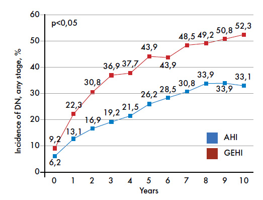 В нашем исследовании распространенность ДН (любой стадии) на период начала наблюдения составила 6,2% и 9,2% в группах АИЧ и ГИЧ соответственно при средней длительности заболевания, не превышающей 5 лет, что не противоречит общемировым тенденциям. Через 10 лет наблюдения распространенность ДН (любой стадии) увеличилась в обеих группах и достигла 32,3% и 52,3% в группах АИЧ и ГИЧ соответственно. Эти различия были статистически значимыми (р<0,05) (рис. 4).