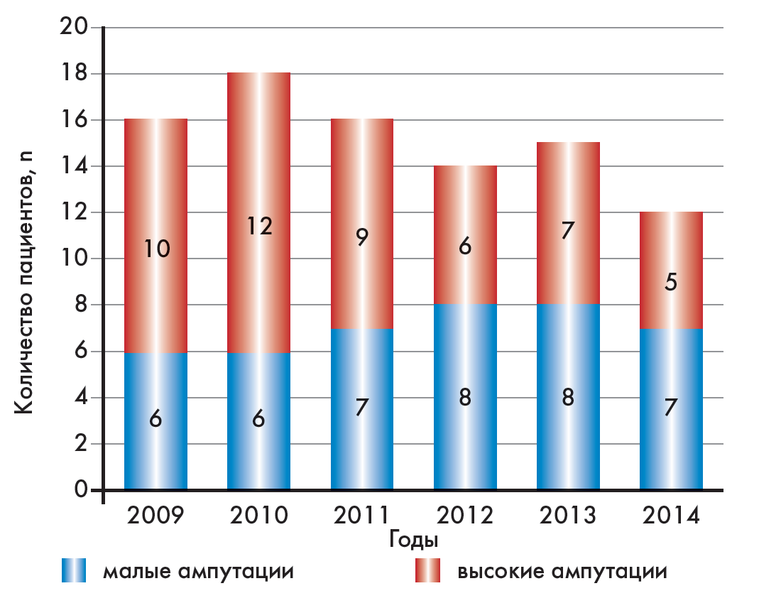 Несмотря на значительное снижение рецидивов язвенных поражений нижних конечностей, за последние 5 лет не получено достоверного снижения числа ампутаций у пациентов с СДС (рис. 4). В динамике снизилось число высоких ампутаций в 1,4 раза (2009–2014 гг.). Ампутации выполнены 19,8% пациентам с СДС (n=79), что составило 0,8% среди всех больных СД. Сохранялась высокая частота реампутаций, которые были проведены в 21% случаев (2009–2014 гг.). Значительная частота ампутаций нижних конечностей определила необходимость дополнительного анализа указанной группы пациентов. Выявлено, что 67% пациентов, которым проведены ампутации нижних конечностей, проживали в населенных пунктах, не имеющих не только специалистов по диабетической стопе, но и врачей-эндокринологов. Большая часть пациентов длительно наблюдалась хирургами, с проведением местной терапии, без коррекции состояния углеводного обмена.
