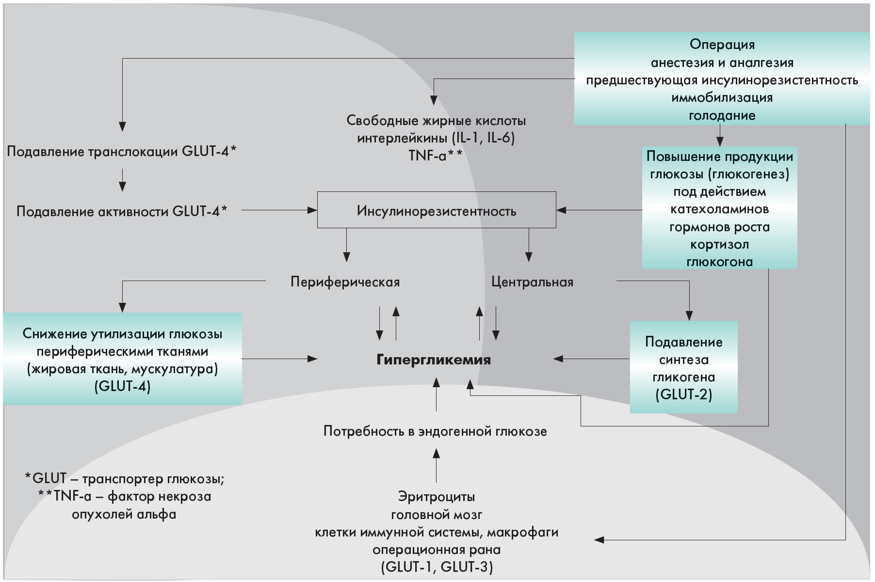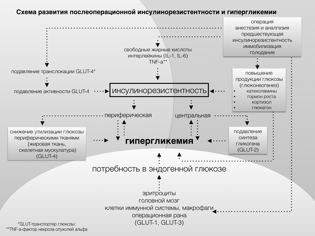 Дальнейшее изучение обусловленных хирургическим стрессом метаболических изменений выявило, что СГ после операции развивается не только за счет действия стрессовых гормонов, интраоперационного введения глюкокортикостероидов, анестетиков, но и за счет снижения утилизации глюкозы периферическими тканями в результате развития ИР [43].