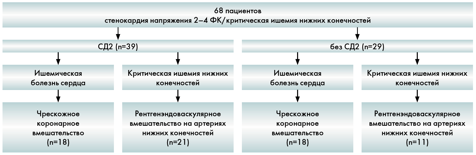 Возраст 45–80 лет, пациенты со стабильной стенокардией напряжения 2–4 ФК или критической ишемией нижних конечностей (КИНК), поступившие для выполнения баллонной ангиопластики со стентированием коронарных артерий или артерий нижних конечностей.