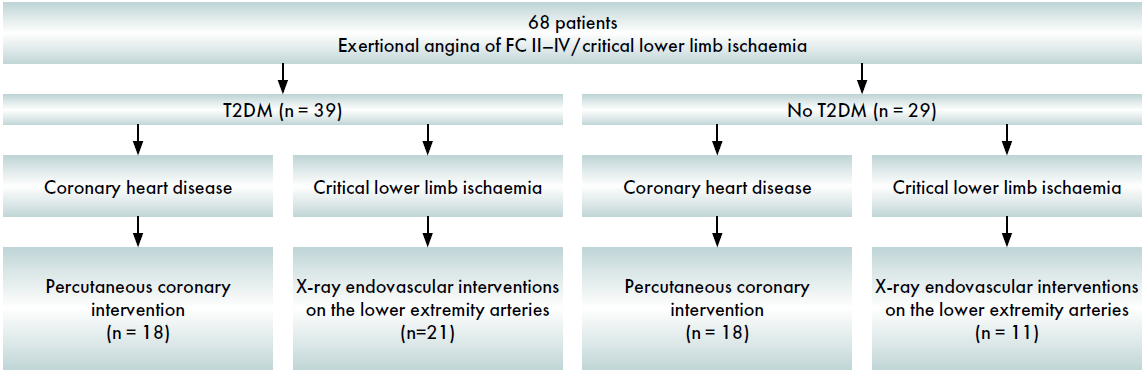 В исследование включено 68 пациентов (40 мужчин, средний возраст 67 [59; 74] лет). Группу 1 составили 39 пациентов с СД2, группу 2 – 29 пациентов без нарушения углеводного обмена (рис. 1).