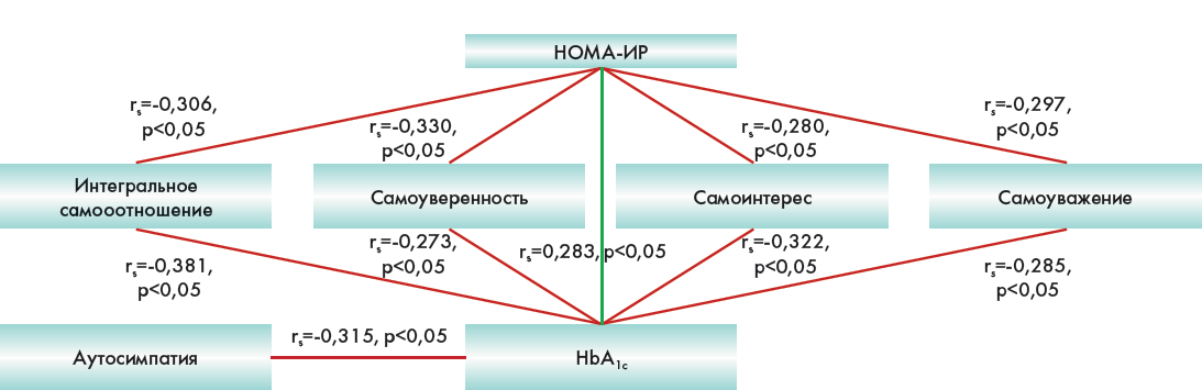 На рис. 1 приведены также корреляции шкал опросника ОСО с уровнем HbA1c. При этом корреляции практически совпадают, что вполне объяснимо тесной ассоциацией между ИР и уровнем HbA1c (корреляция между ними является прямой). Единственное отличие в том, что HbA1c имеет отрицательную корреляцию со шкалой «Аутосимпатия», тогда как ИР таковой не обнаруживает. Данное единичное различие ничего не меняет по существу и требует уточнения в дальнейших исследованиях.