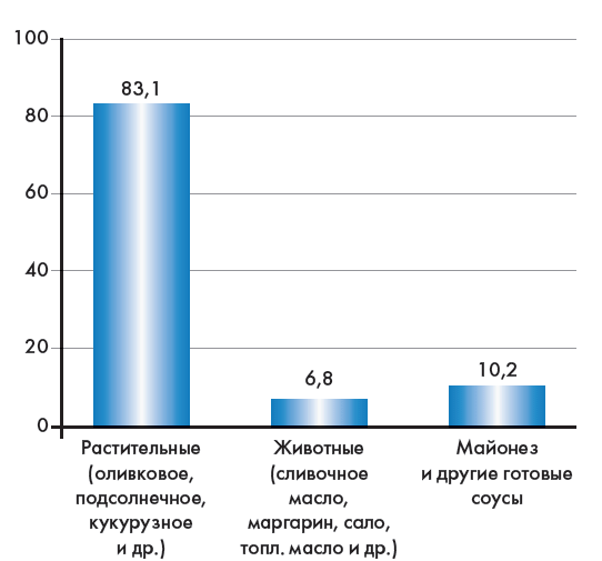 Рис. 4. Распределение частоты ответов респондентов на вопрос «Какие жиры Вы чаще употребляете?» (анкета «Особенности образа жизни»), %.