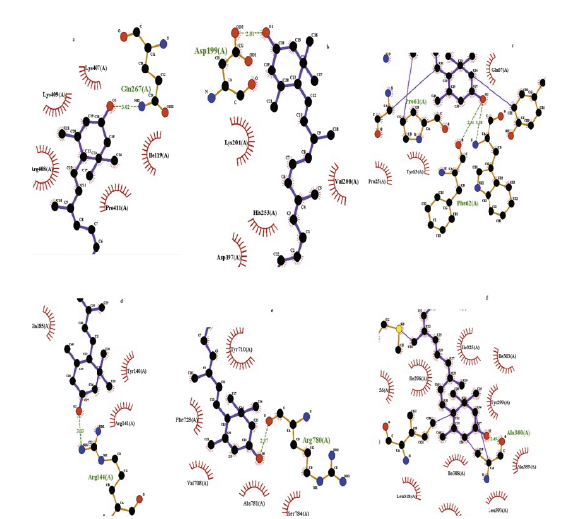 2. Figure 2. Docking interaction of lutein and zeaxanthin with target receptors predicted by LigPlot (blue line – ligand bonds; red line – non ligand bonds; dotted lines – hydrogen bonds and its length; half red circle – non ligand residues involved in the hydrophobic contacts; black dots – corresponding atoms involved in the hydrophobic contacts).