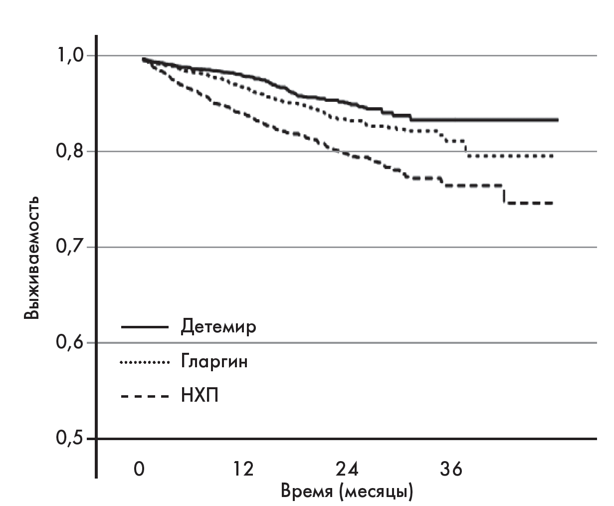 Рис. 1. Выживаемость больных СД2 при использовании различных препаратов базального инсулина [61].