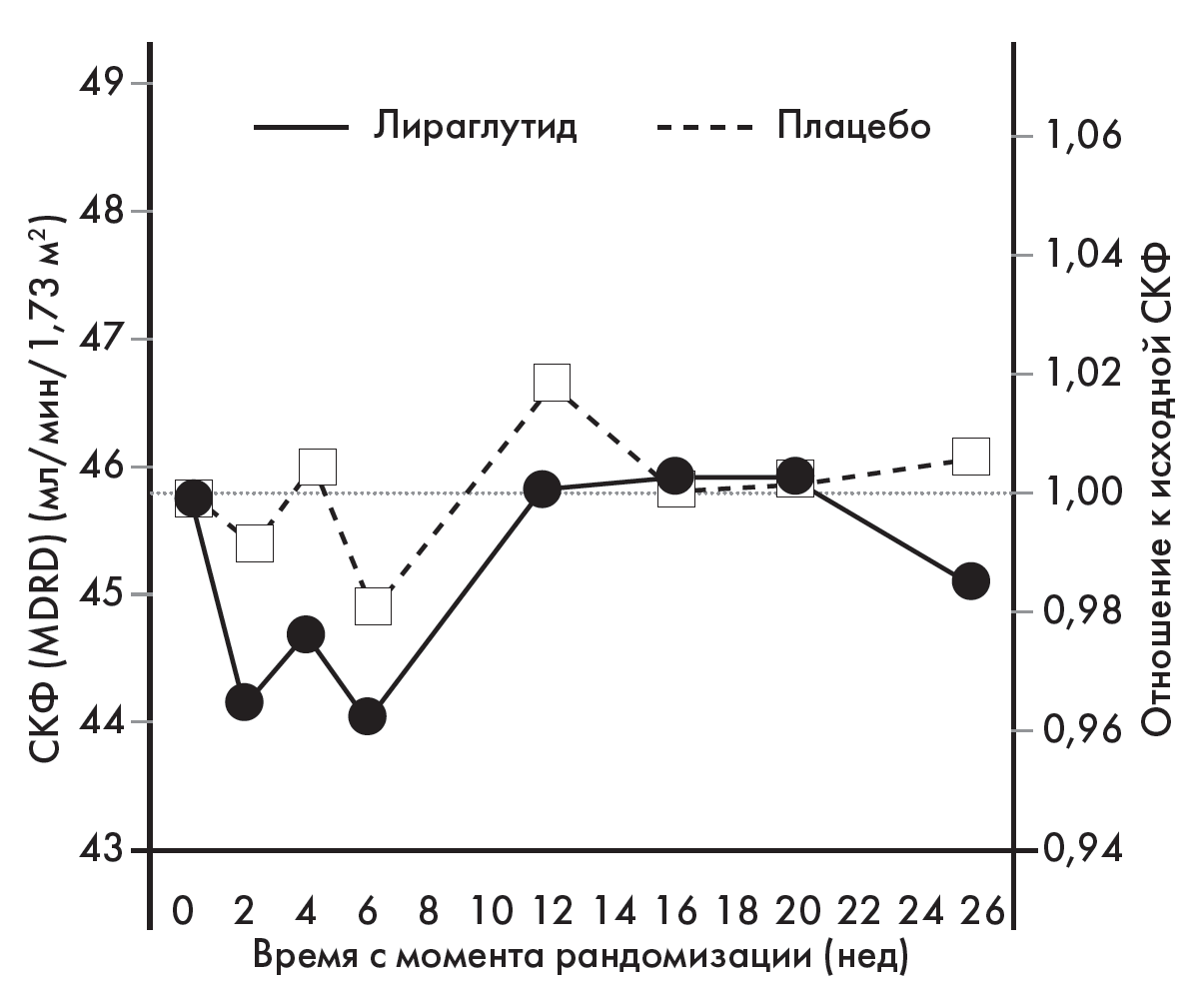 Рис. 2. Динамика СКФ у пациентов с СД2 и ХБП С3 в течение 26 недель при терапии лираглутидом в сравнении с плацебо [67].
