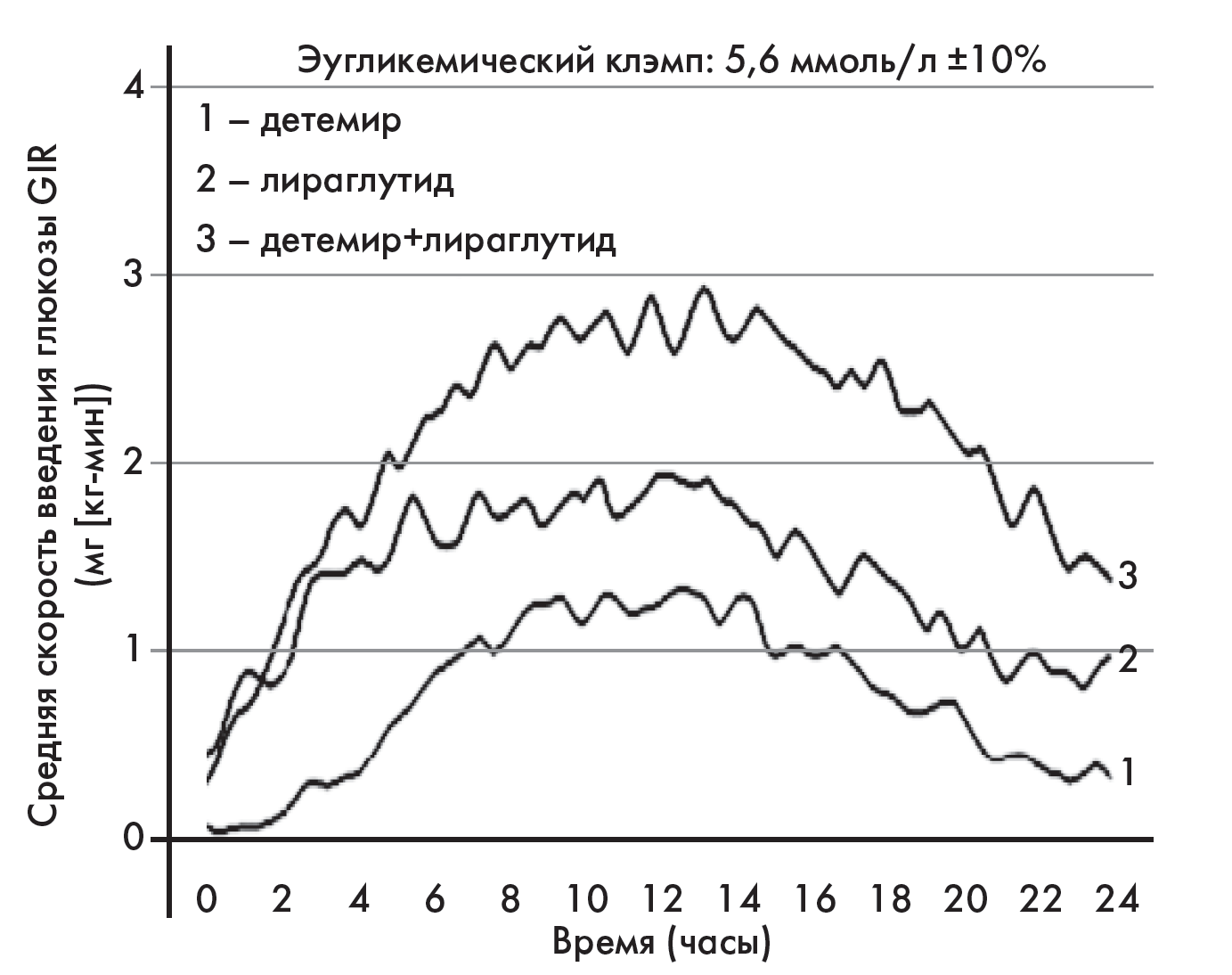 Изучение фармакологических профилей детемира и лираглутида (в дозе 1,8 мг) при их совместном применении у пациентов с СД2 показало, что в равновесном состоянии лираглутид и инсулин детемир взаимно усиливают сахароснижающий эффект, не оказывая значимого влияния на фармакокинетические параметры (AUC и Cmax) друг друга [69]. Также введение лираглутида не влияло на концентрацию детемира в течение 24 часов, а сумма AUC (GIR) лираглутида (1982 мг/кг) и детемира (1058 мг/кг) при использовании по отдельности была сопоставимой при их совместном использовании (2947 мг/кг). Таким образом, комбинация лираглутида в дозе 1,8 мг и детемира характеризуется аддитивным сахароснижающим эффектом без взаимного влияния на фармакодинамический и фармакокинетический профили.