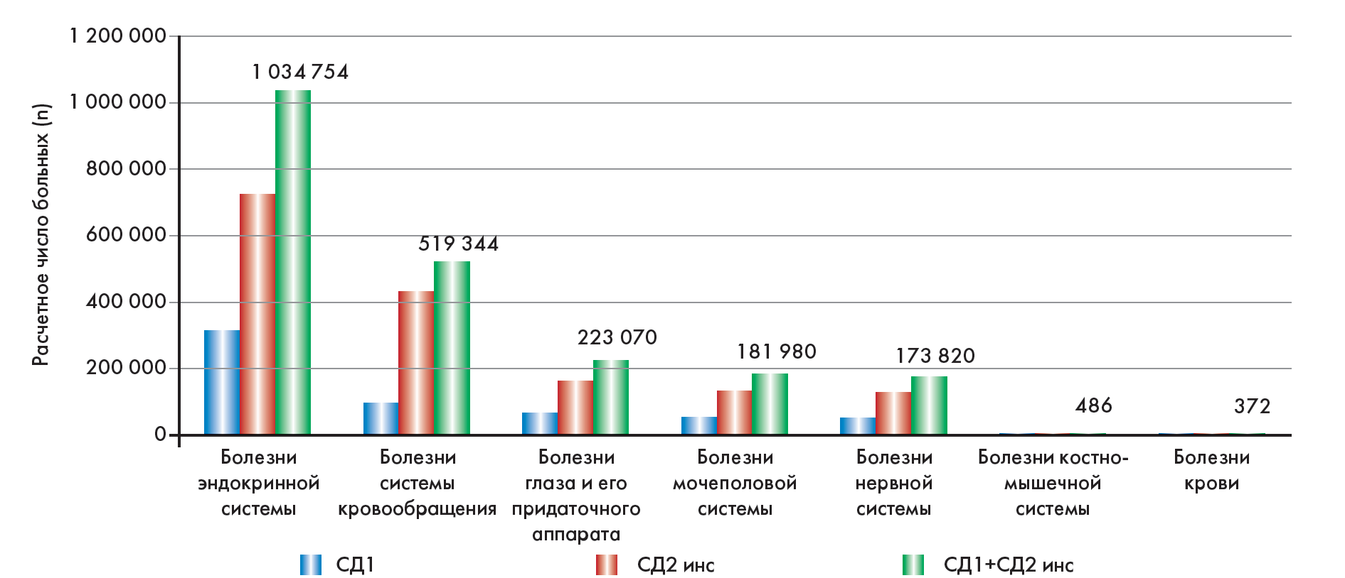 1. Рис. 1. Расчетная численность больных СД, находящихся на инсулинотерапии, получивших медицинскую помощь в 2014 г. по основному заболеванию и его осложнениям (в разрезе классов заболеваний). | |