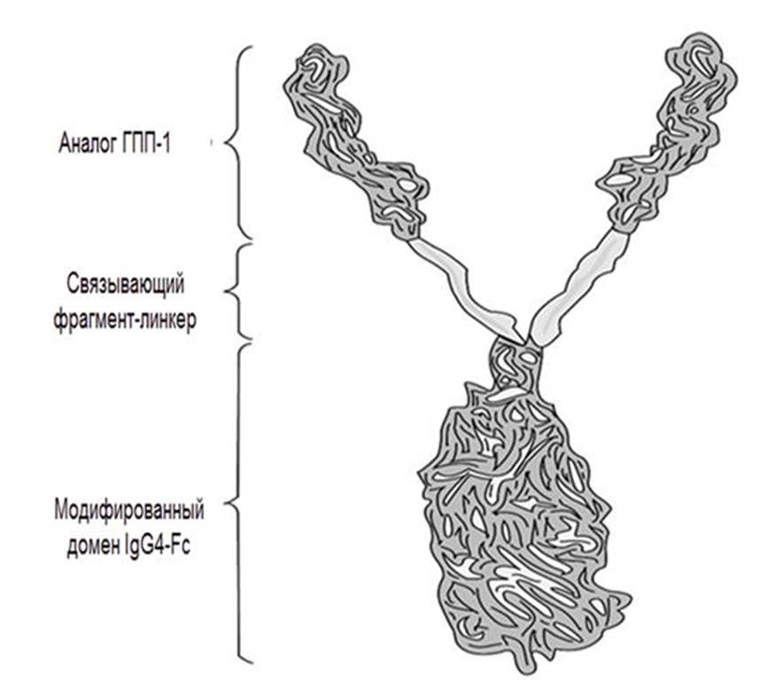 Дулаглутид является рекомбинантным белком, который получен в результате соединения аналога ГПП-1 человека с модифицированным Fc-фрагментом иммуноглобулина G4 (IgG4) человека (рис. 1) [17, 18]. Fc-домен заметно увеличивает период полувыведения молекулы из плазмы, растворимость, стабильность и активность соединенного с ним компонента [19].