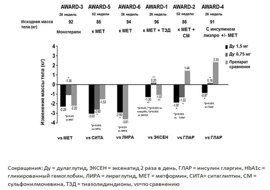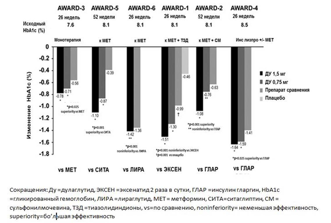 Дулаглутид является препаратом группы агонистов рецепторов ГПП-1, сахароснижающее действие которого реа лизуется через воздействие на инкретиновую систему. Равновесные концентрации дулаглутида в плазме достигаются через 2–4 недели при введении препарата 1 раз в неделю. В клинических исследованиях AWARD 1–6 принимали участие пациенты с СД2, использующие разные схемы терапии: от диеты и изменения образа жизни, моно- и комбинированной пероральной сахароснижающей терапии и до инсулинотерапии. Степень снижения HbA1c (основного показателя эффективности терапии) от исходного уровня в первичной конечной точке на фоне применения дулаглутида в целом зависела от дозы препарата и была значимо больше, чем на фоне применения активных препаратов сравнения и плацебо (AWARD 1–5) либо характеризовалась не меньшей эффективностью относительно препарата сравнения (AWARD 6). Оценка дополнительных показателей эффективности показала, что контроль гликемии на фоне терапии дулаглутидом сохранялся в течение длительного периода времени и что больший процент пациентов, получавших дулаглутид, достиг целевого уровня HbA1c<7,0% в сравнении с пациентами, получавшими плацебо и/или препараты группы сравнения. В большинстве исследований AWARD отмечалось снижение глюкозы плазмы натощак, глюкагона и массы тела. Хотя нежелательные явления на фоне терапии дулаглутидом были распространены, однако их частота была сравнима с частотой, наблюдавшейся на фоне применения активных препаратов сравнения в большинстве исследований. Серьезные нежелательные явления в целом отмечались нечасто, за исключением пациентов с более тяжелым течением СД или с большей длительностью заболевания. Гипогликемические и иммуногенные реакции также отмечались редко. В составе различных терапевтических комбинаций дулаглутид продемонстрировал эффективный контроль гликемии и клинически значимое снижение массы тела.