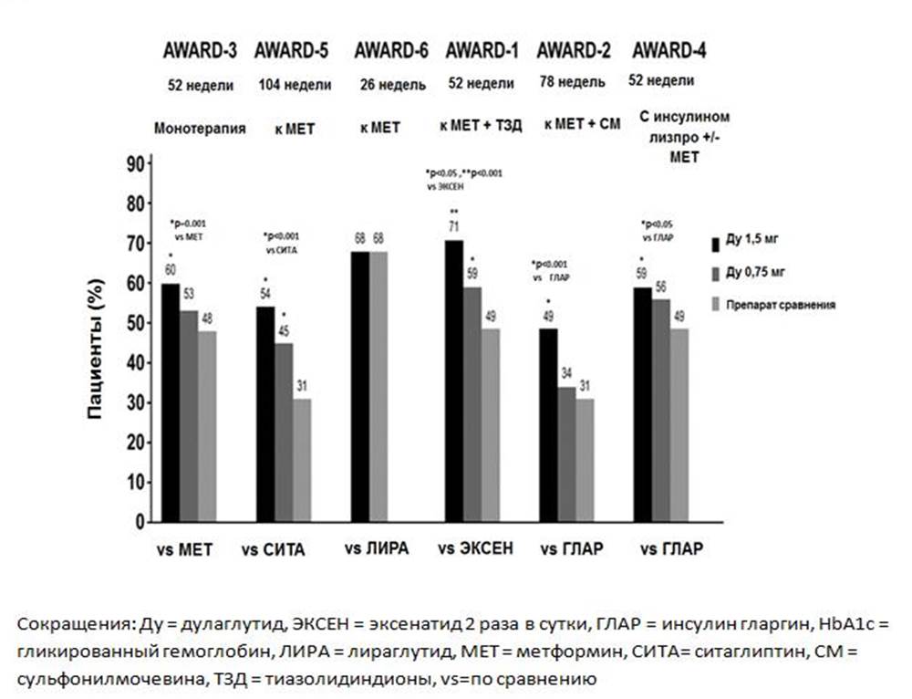 3. Рисунок 3. Доли пациентов, достигших целевого HbA1c 7% в финальной конечной точке в исследованиях AWARD 1–6 | |