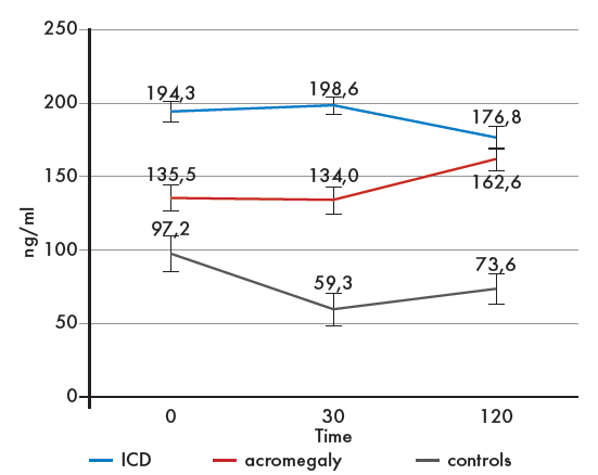 Материалы и методы. В исследование были включены 62 пациента: 20 – с БИК, 21 – с акромегалией, 21 – контрольная группа. Контрольную группу составили лица без нарушений углеводного обмена, без БИК и акромегалии, сопоставимые по индексу массы тела (ИМТ) и возрасту с исследуемыми больными. Всем пациентам был проведен оральный глюкозотолерантный тест (ОГТТ) с 82,5 г моногидрата глюкозы с определением глюкозы плазмы крови исходно и на 120-й минуте теста; исходно, на 30-й и 120-й минуте производился забор крови для исследования гормонов инкретинового ряда (ГИП, ГПП-1), глюкагона и грелина.