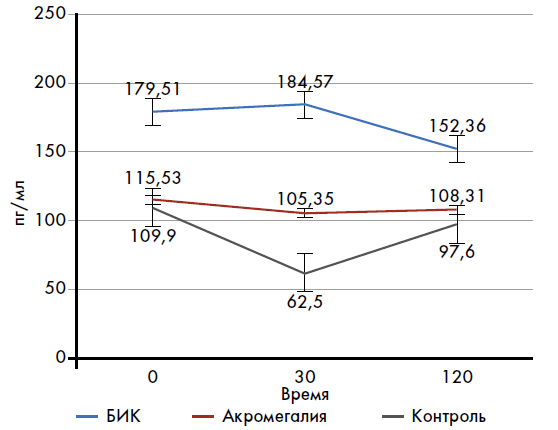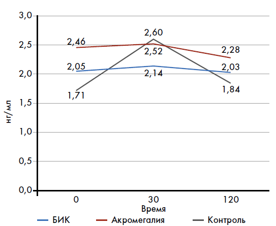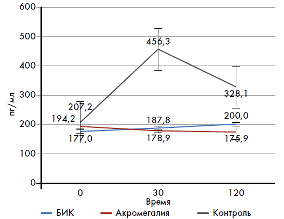 2. Рис. 2. Секреция ГИП у пациентов с БИК и акромегалией. | |