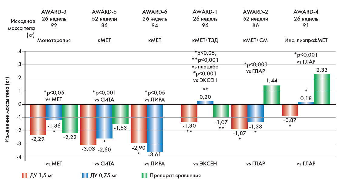 4. Рис. 4. Изменение массы тела от исходной в первичной конечной точке в исследованиях AWARD 1–6