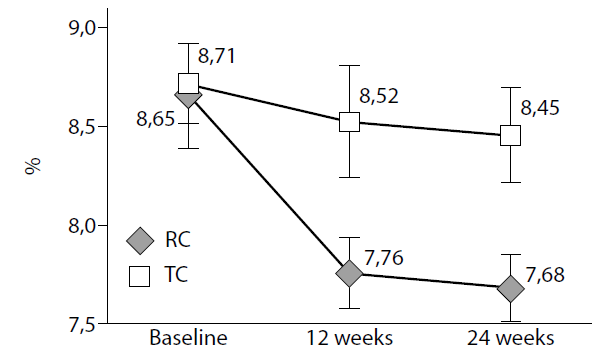 Через 24 нед исследования исходный уровень HbA1c (8,7% в двух исследуемых группах) в группе ДК снизился до 7,7% по сравнению с 8,5% в группе ТК (рис. 1).