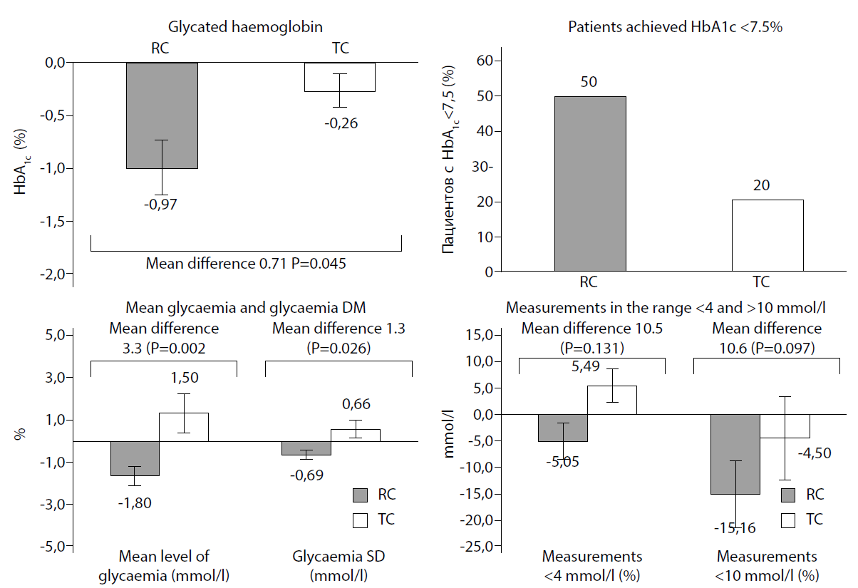 1) изменение к концу исследования по сравнению с исходным уровнем следующих показателей: средний уровень гликемии, вариабельность гликемии (SD), измерения глюкозы крови в диапазоне <4 и >10 ммоль/л, показатели качества жизни; 2) частота эпизодов диабетического кетоацидоза (ДКА) и тяжелой гипогликемии за время исследования.
