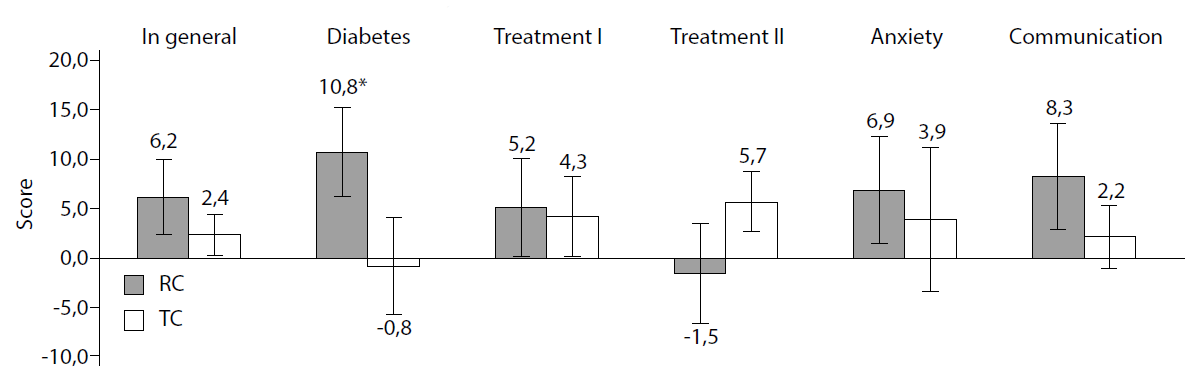 Рис. 4. Изменение показателей качества жизни у детей с СД1 к концу исследования относительно исходных уровней. Данные представлены в виде Среднее ± SEM. Примечание: * – уровень p<0,05 при сравнении показателей групп ДК и ТК.