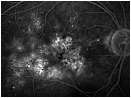 Рис. 3. Кистозный макулярный отек по данным флуоресцентной ангиографии.