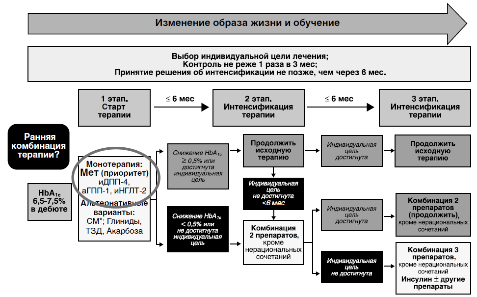 2. Рис. 2. Возможное место ранней комбинированной терапии в алгоритмах помощи больным СД2 (адаптировано из [7]). | |