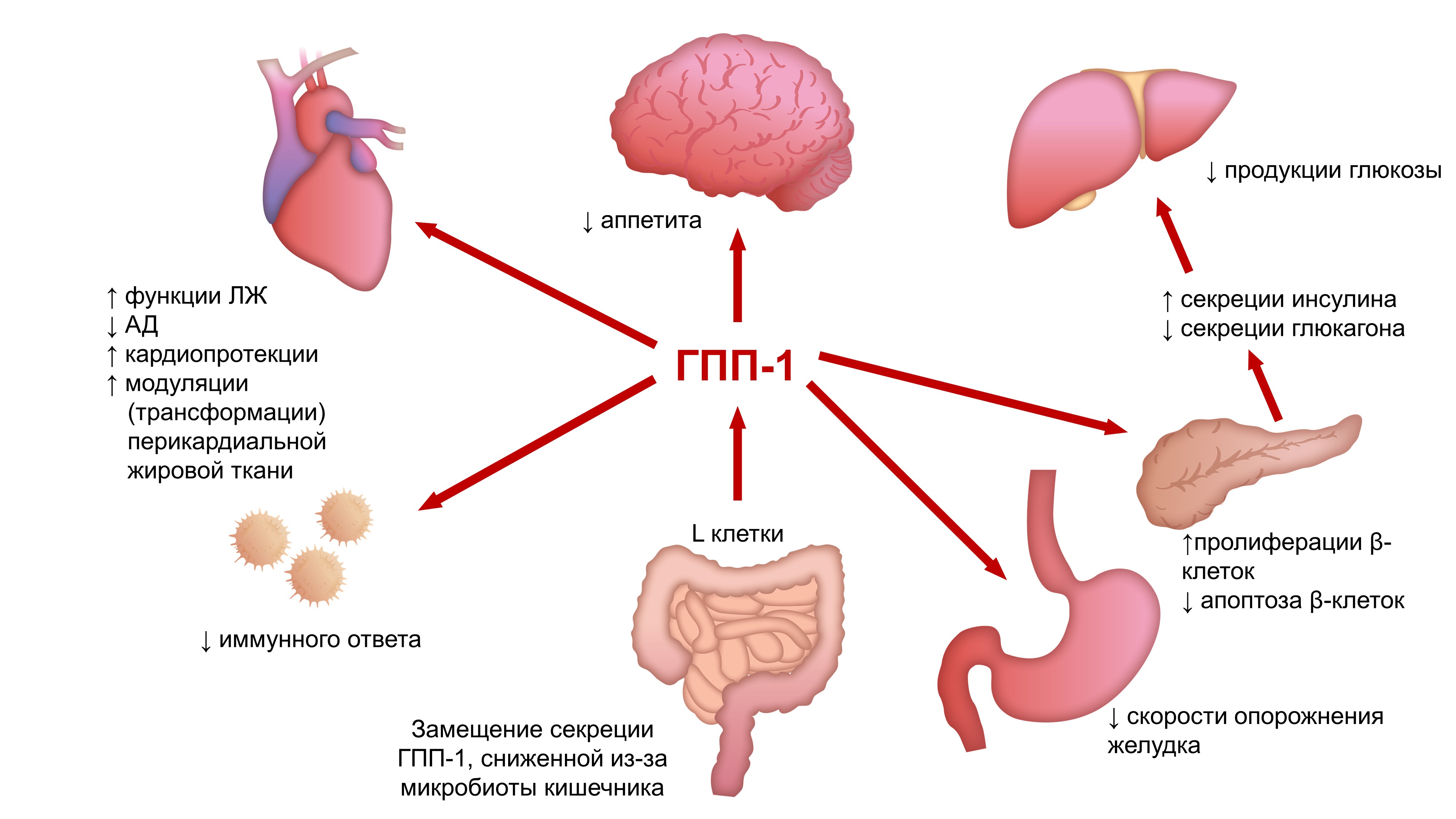 Рис. 2. Физиологические эффекты глюкагоноподобного пептида-1 (ГПП-1).