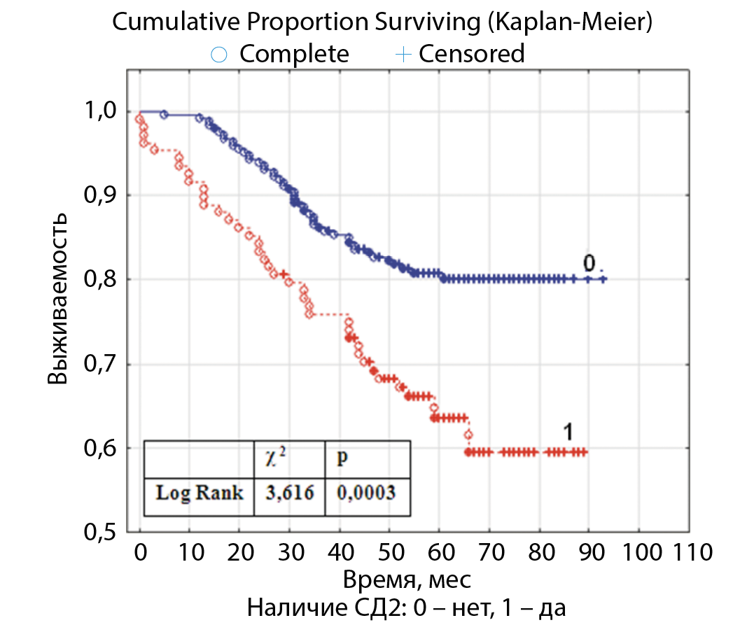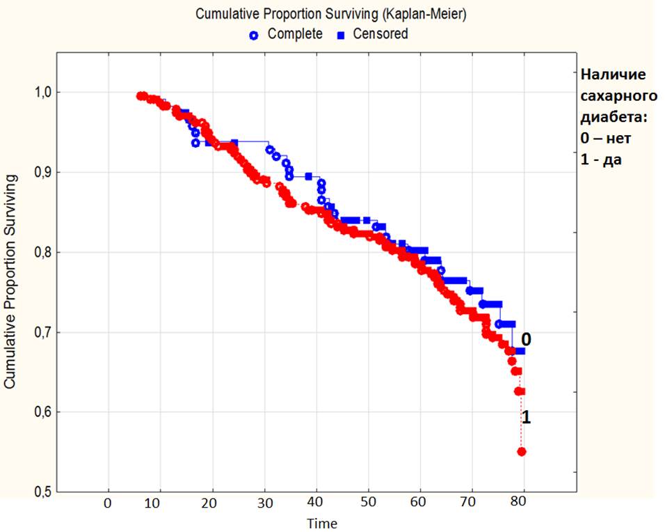 При наблюдении за пациентами на протяжении 5 лет после перенесенного инфаркта миокарда зарегистрирован 121 случай летального исхода среди пациентов 1 группы (33,8%) и 135 случаев – во 2 группе (26,8%; р=0,026), при этом в структуре причин летальных исходов доля сердечно-сосудистых заболеваний была сопоставима в исследуемых группах и составила 78% и 65% (р=0,4). Исследование времени дожития методом построения кривых Каплана-Майера в зависимости от наличия у больных СД2 продемонстрировало различные результаты в исследуемых группах.