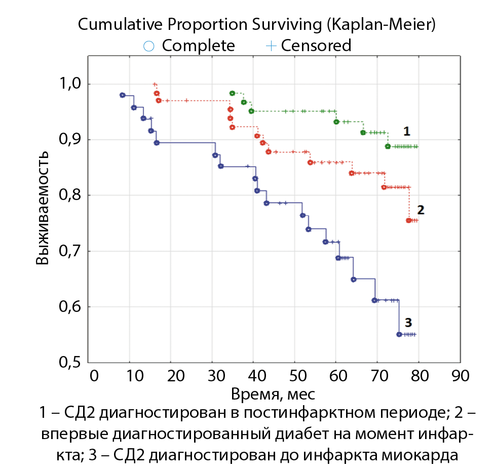 Таким образом, в когорте трудоспособных больных сочетание перенесенного инфаркта миокарда и СД2 не всегда приводило к однозначным общепринятым неблагоприятным прогностическим последствиям по сравнению с постинфарктными пациентами без СД2. Наличие СД2 у пациентов трудоспособного возраста при небольшей длительности заболевания в настоящем исследовании не влияло на отдаленный прогноз.