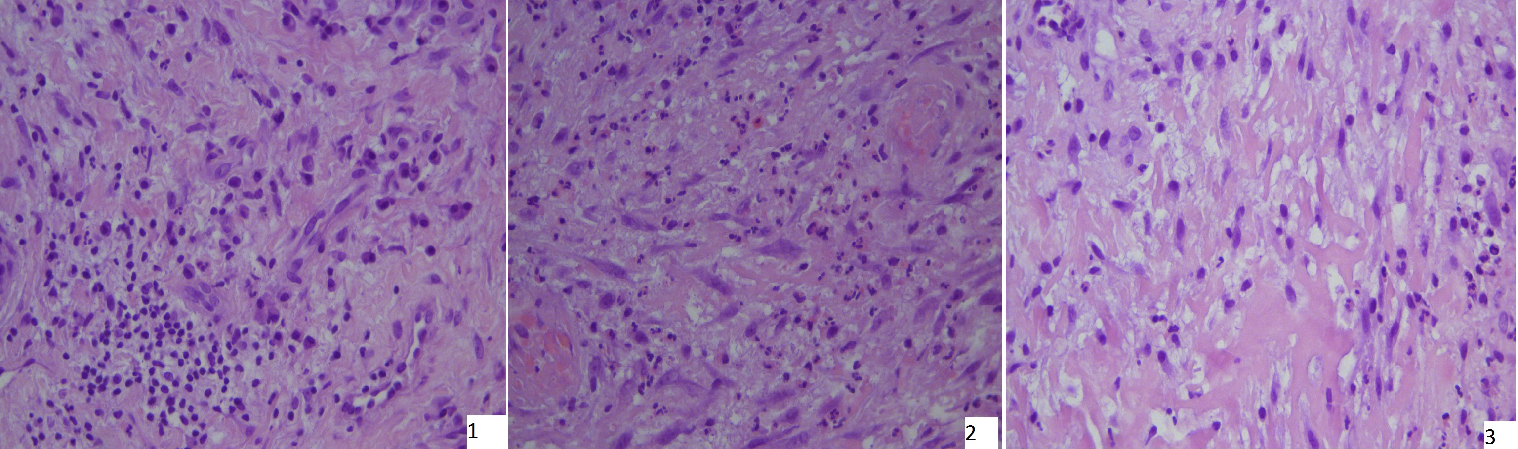 2. Рис. 1. Типичная гистологическая картина биоптатов раны на 0, 10, 15-е сутки местного лечения: 1) Эпидермис сохранен, в дерме очаги плазмоцитарной и лимфоцитарной инфильтрации; 2) Созревающая грануляционная ткань представлена мелкими сосудами, диффузной лимфо- и лейкоцитарной инфильтрацией (сегментоядерные нейтрофилы) и нежной рыхлой соединительной тканью; 3) Зрелая грануляционная ткань, умеренная лимфоцитарная инфильтрация и лейкоцитарная инфильтрация, представленная плазмоцитами с преобладанием сегментоядерных нейтрофилов, выраженная пролиферация фибробластов, сосудистый лейкостаз.