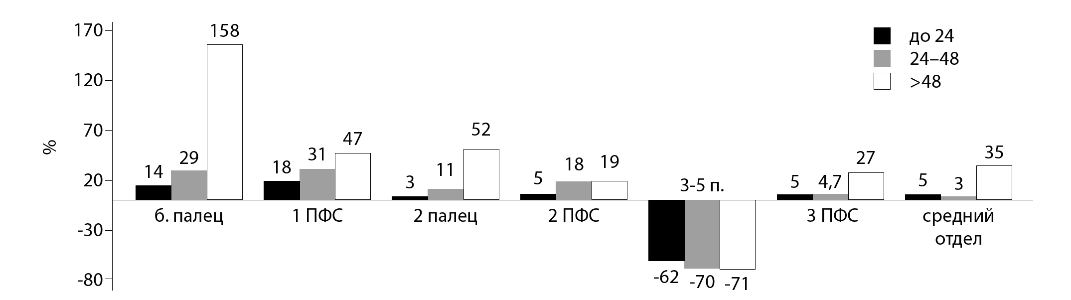 На сроках наблюдения более 48 мес происходило значимое увеличение нагрузки под 1-м и 2-м лучами (1-й и 2-й палец и соответствующие им плюсневые кости), 3-м ПФС, а также под средним отделом. При этом наибольший прирост ПД отмечен под большим пальцем (в 11 раз в сравнении с исходным). Динамика давления под 4, 5-м ПФС была недостоверна.