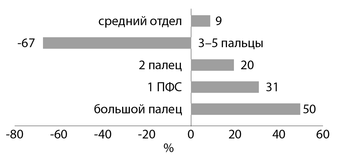 Results. PP increased: under the hallux 50%; 1st metatarsal–30.7%; 2nd toe–20%; 2nd toe–6%; midfoot–9%. PP decreased under 3–5 toes up to 67%. Significant changes at the first period were found under 3–5 toes only (−62%). The increase in loading under the other parts of the foot appeared at 24 months; however, these changes became significant between 24 and 48 months and peaked after 48 months of follow-up. The maximal increase of PP was noticed under the hallux, the 2nd toe, metatarsals 1–3 and the midfoot.